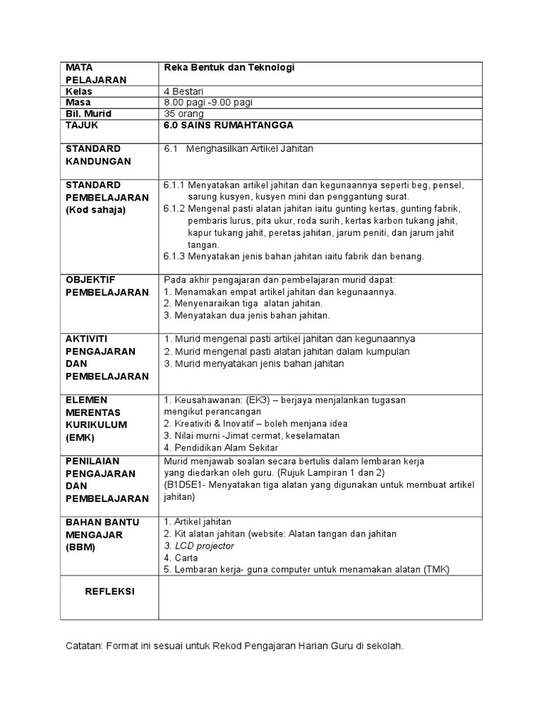 Format Rph Rbt Tahun 4 Sains Rumah Tangga Pdf